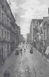 Ancora una foto di un tempo scomparso ed č quasi incredibile pensare, che il vero traffico di quel periodo consistesse di carri e da carrozze e naturalmente dalla gente. Confrontare con l'attualita!